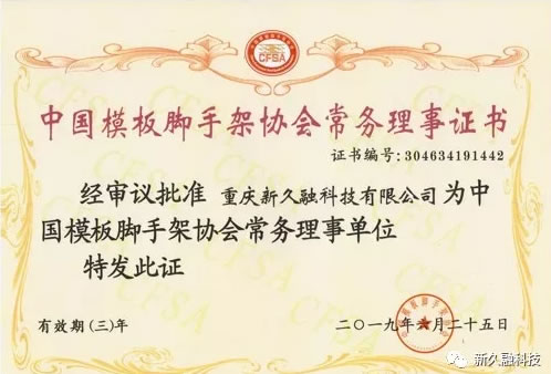 熱烈祝賀重慶新久融科技榮獲中國(guó)模板腳手架協(xié)會(huì)常務(wù)理事單位稱號(hào)2019年6月,新久融科技正式加入中國(guó)模板腳手架協(xié)會(huì),并榮獲協(xié)會(huì)常務(wù)理事單位稱號(hào)。中國(guó)模板腳手架協(xié)會(huì)是國(guó)家一